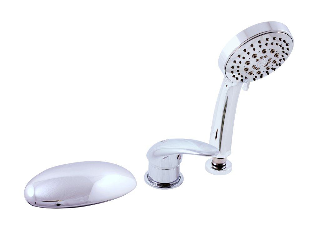 Three-hole bath mixer with mixer switch, self-watering shower and 2m hose.