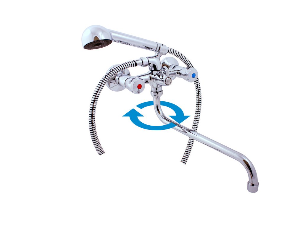 Vodovodní baterie pro vanu a umyvadlo nástěnná s keramickým přepínačem, kulatým ramínkem, sprchou a vidlicí na odkládání sprchy.