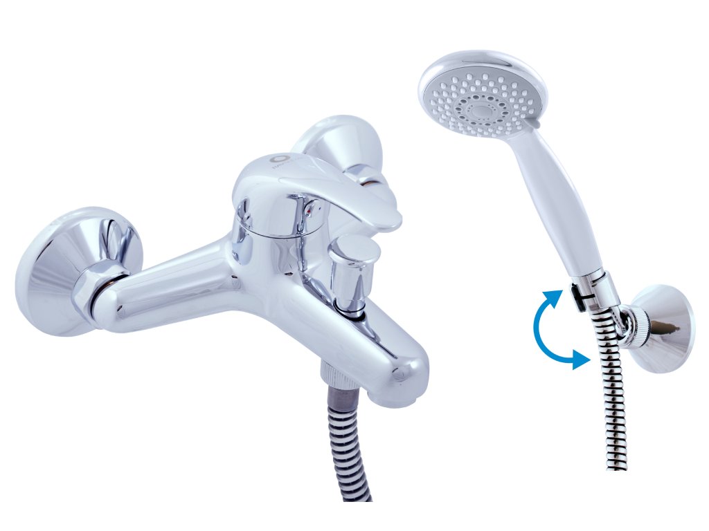 Wall mounted bath mixer with shower and swivel holder.