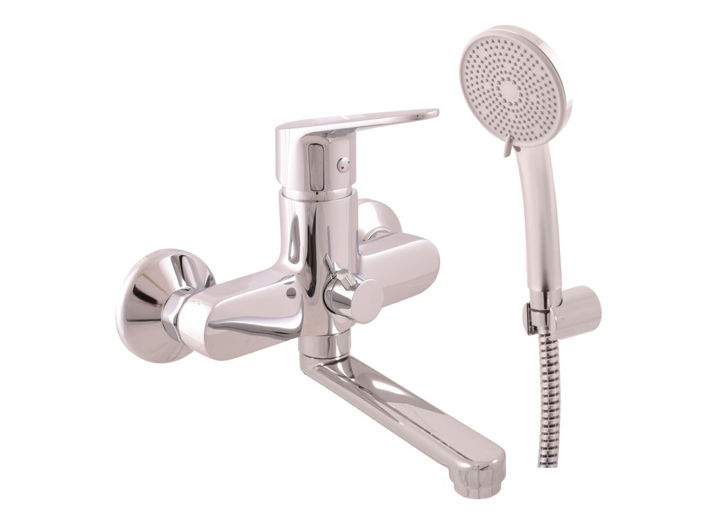 Wall mounted bath mixer with flat swivel arm, shower and fixed holder.